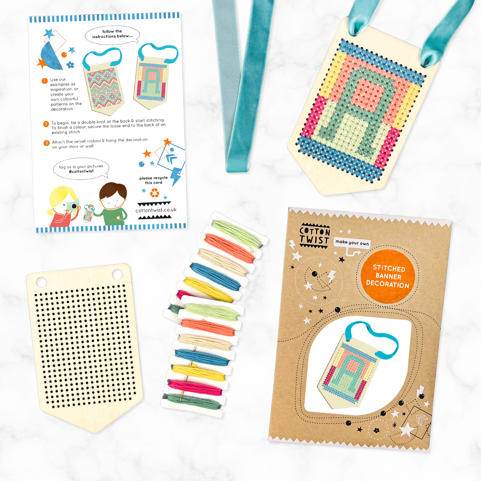 Allt material ingår för en broderad minitavla. Lämpligt från 6 år. Innehåller ej plast. Godkänt UKCA/UKNI/CE & FSC. Innehåll: minitavla i trä, 2 paket med 7 färgade bomullstrådar i varje, broderinål, upphängningsband och instruktioner.