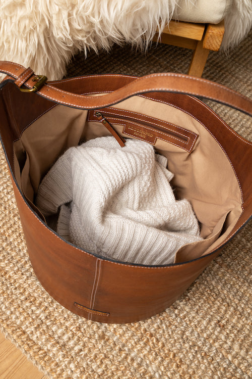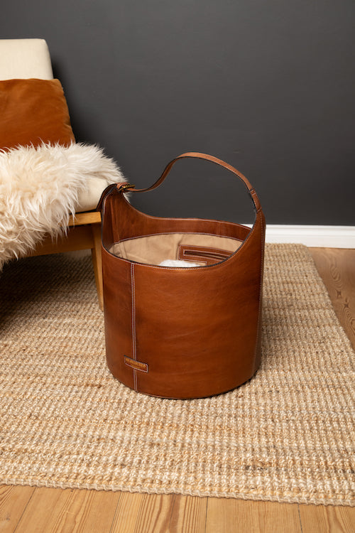 Perfect for knitters who value both style and convenience, this durable leather bucket is an essential addition to your crafting collection.