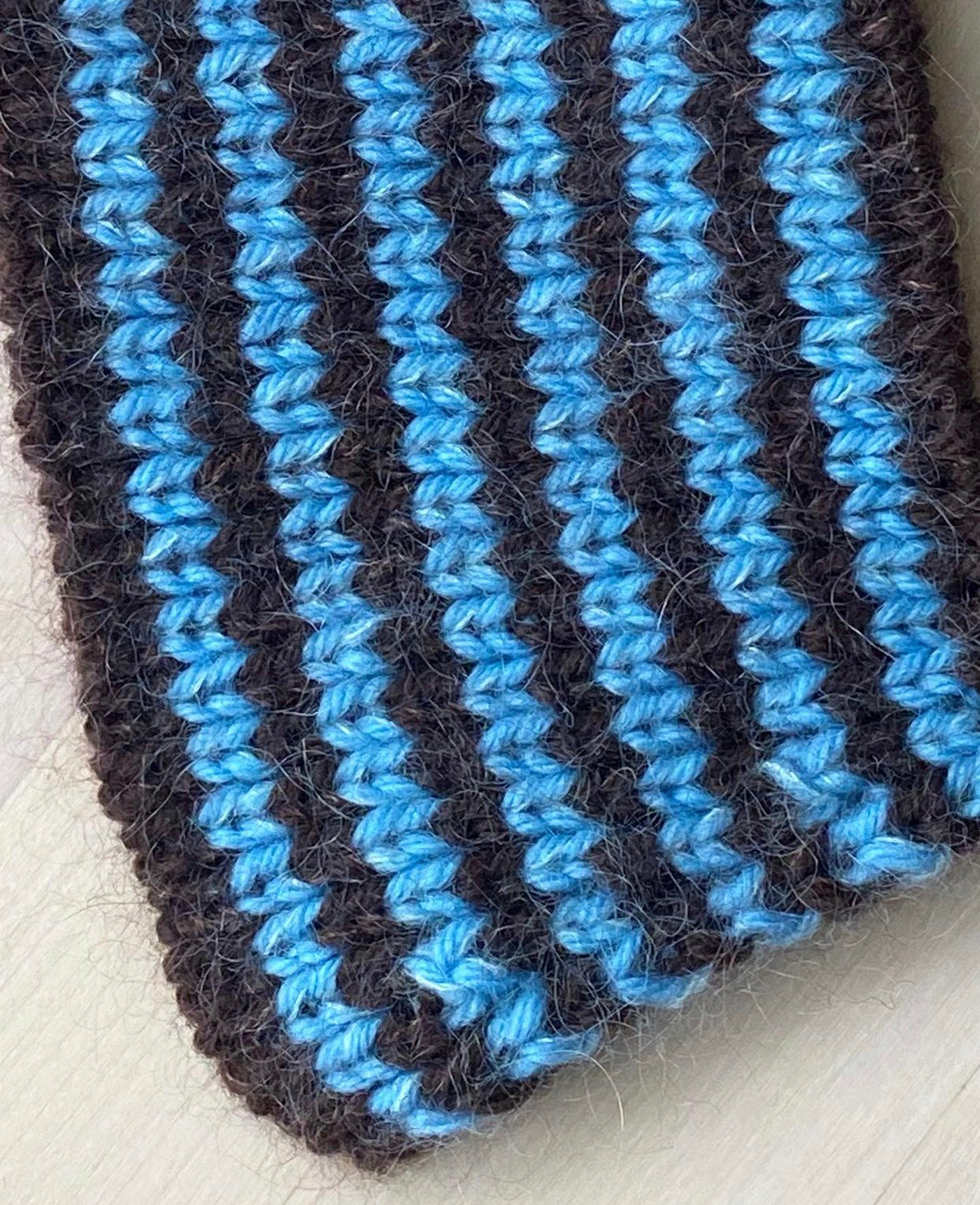 Med det två trådarna lagda samman på sticka 5 mm 16 m och 24 p = 10 x 10 cm i slätstickning.