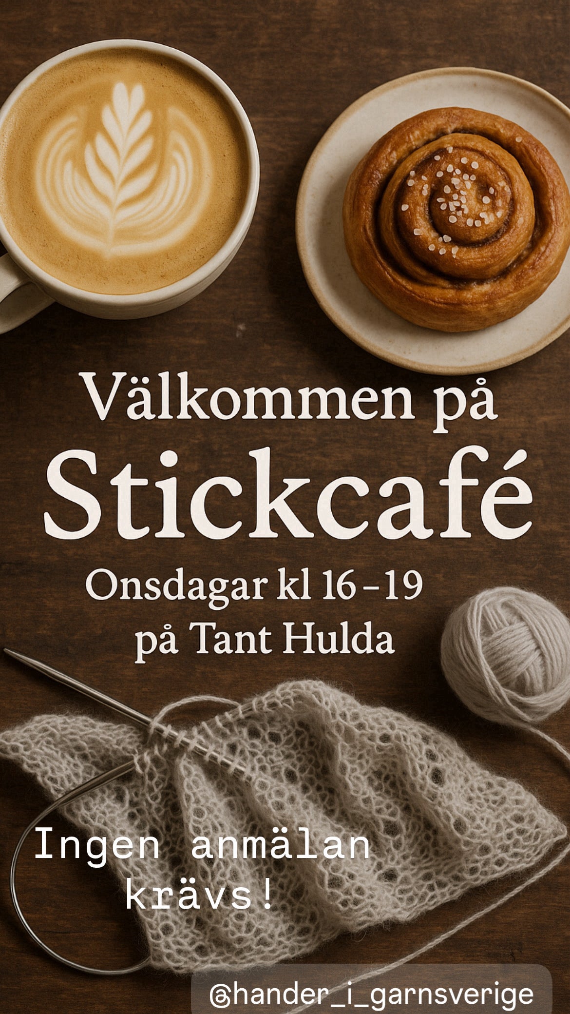 Ta med din stickning, virkning, broderi eller ditt favorithandarbete, och njut av en härlig stund tillsammans med andra som älskar att skapa. Här finns plats för alla – från nybörjare till erfarna stickare.