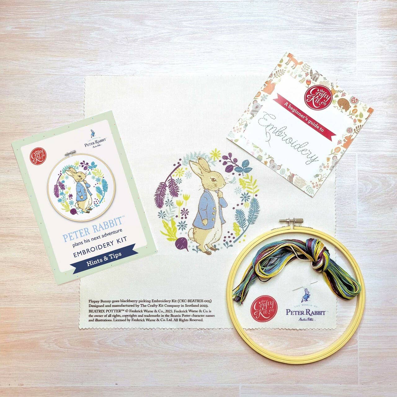 Stitch yourself a beautiful Peter Rabbit standing still pondering his next move. He looks very smart in his blue collared jacket and gold buttons with his ears alert as he stops for a moment and listens for Mr McGregor. You'll find great joy creating this sustainable embroidery kit - one of the first of our brand new kits designed under license from BEATRIX POTTER™ ©. It's also a wonderful gift for any fan of Beatrix Potter - either as a kit or as the finished project! This craft kit is perfect for beginners to make yourself or as a lovely boxed gift. Your embroidery kit contains: 18cm bamboo hoop, pre-printed fabric, DMC embroidery thread, needle, full colour pattern chart, embroidery booklet. - Suitable for beginners - Approximately 12 hours of crafting enjoyment - Finished size 18cm - B1G1 - your purchase enables us to support global charities - Designed and made in Scotland by The Crafty Kit Company - Kit components are sourced in the UK where possible.