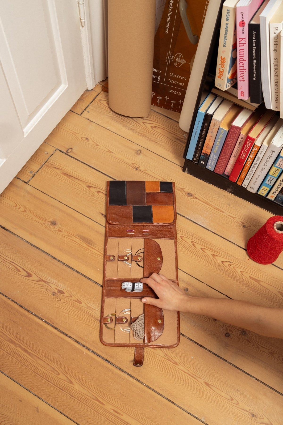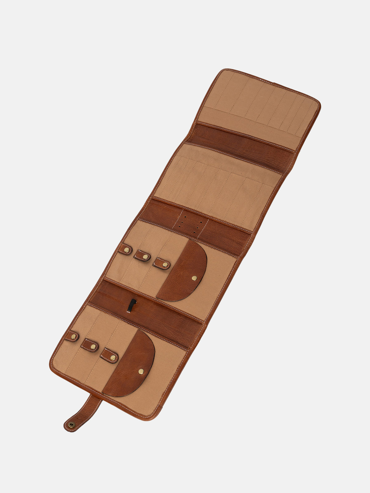 PROJECT 14 is our XL needle case for organizing your interchangeable circular knitting needles. It features 6 pockets with snap closures to securely hold your wires. Behind these pockets, there are open compartments where you can store knitting patterns or similar items. An elastic band allows you to keep your measuring tape handy, and there are 6 holes in the leather to accommodate 3 needles. A total of 18 slim pockets for knitting tips, crochet hooks of stocking needles, keeps them organized. Finally, you have 2 small pockets with flap and button closure where you can store your scissor and other loose knitting accessories. The entire needle case elegantly folds together and fastens with a snap, making it easy to carry your essential knitting tools.