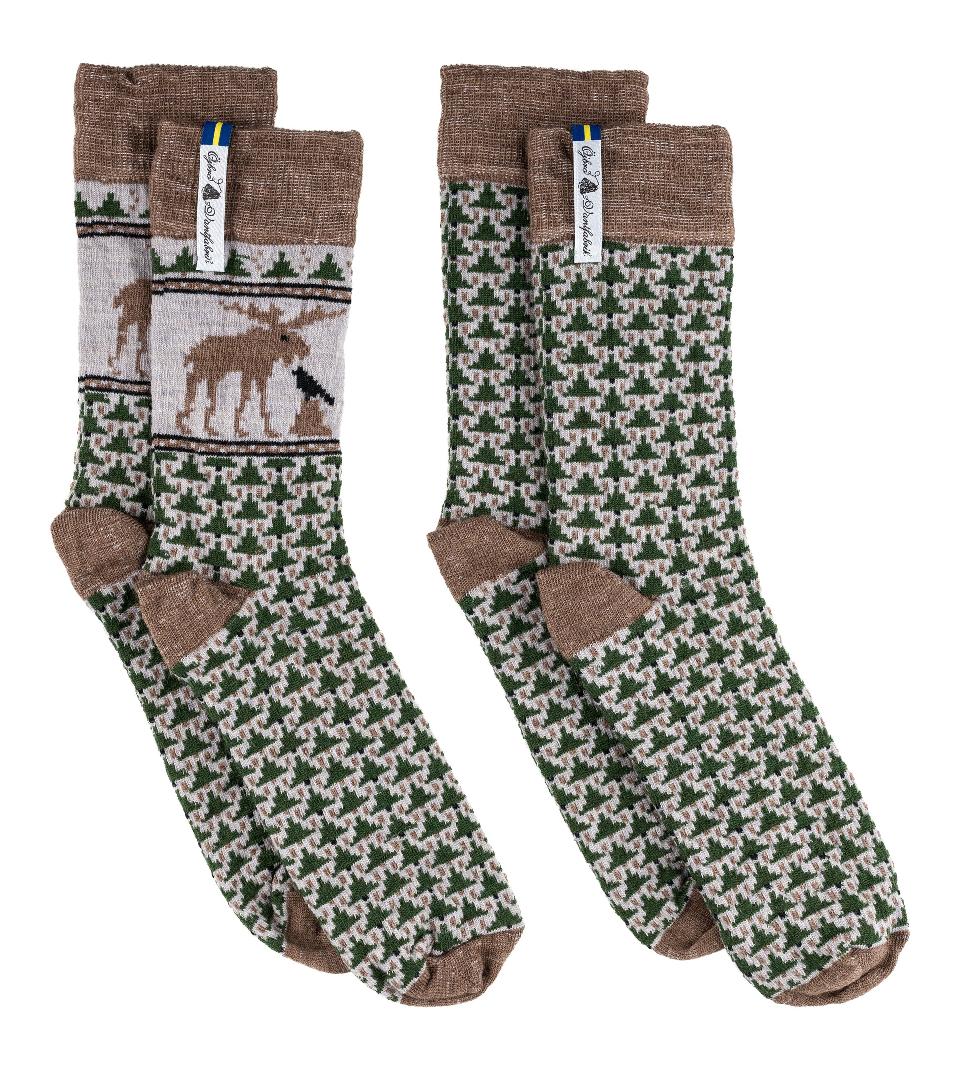 Skogen, denna merinoull strumpa är uppstickad i vår design Skogen, som är inspirerad av allas vår allemansrätt, en Sverigesymbol här gestaltad av skogens konung, Älgen, i samspråk med korpen. Vi har sedan mönstersatt och färgsatt i naturens färger. Öjbro Vantfabrik brinner för att föra våra olika sticktraditioner vidare.